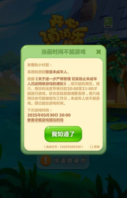 (图说:《开心消消乐》在游玩时间外弹窗提示)