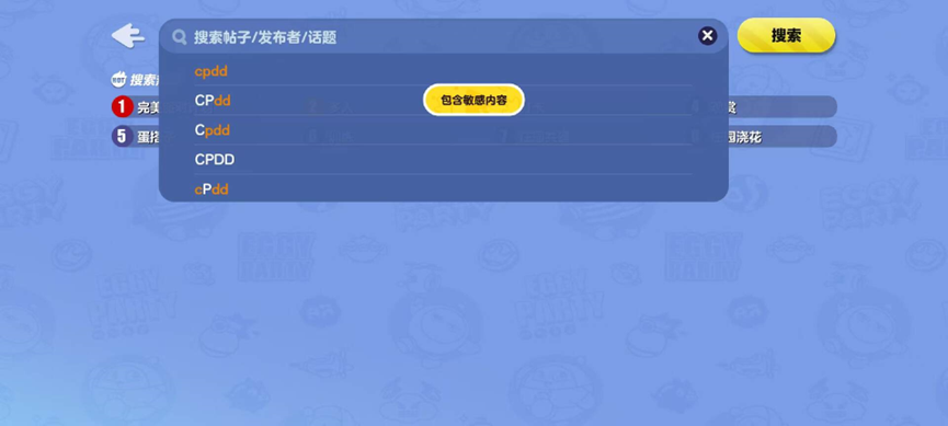 相对较为积极的案例是,一些游戏会将相关发言设置为敏感词或特殊词语,无法在公屏或私信中打出,或对未成年人账号加以屏蔽,例如在《蛋仔派对》内部的游戏论坛搜索功能中,就将cpdd设为敏感内容,无法搜索相关的帖子/发言者/话题。