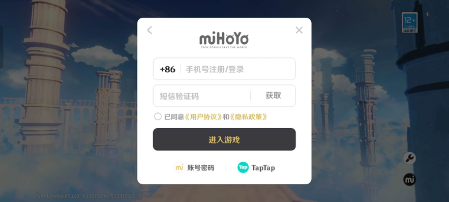 (图说:米哈游《原神》中,开始游戏前的弹窗中要求用户阅读且同意用户协议与隐私政策后方可进入游戏,且右上角适龄提示为12+)