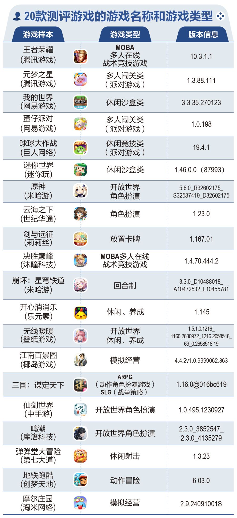 具体样本包括《王者荣耀》(腾讯游戏)、《我的世界》(网易游戏)、《蛋仔派对》(网易游戏)、《元梦之星》(腾讯游戏)、《崩坏:星穹铁道》(米哈游)、《鸣潮》(库洛科技)、《决胜巅峰》(沐瞳科技)、《原神》(米哈游)、《江南百景图》《椰岛游戏》、《迷你世界》(迷你玩)、《仙剑世界》(中手游)、《地铁跑酷》(创梦天地)、《摩尔庄园》(淘米网络)、《三国:谋定天下》(Bilibili)、《球球大作战》(巨人网络)、《无限暖暖》(叠纸)、《剑与远征》(莉莉丝)、《弹弹堂大冒险》(第七大道)、《云海之下》(世纪华通)、《开心消消乐》(乐元素)。