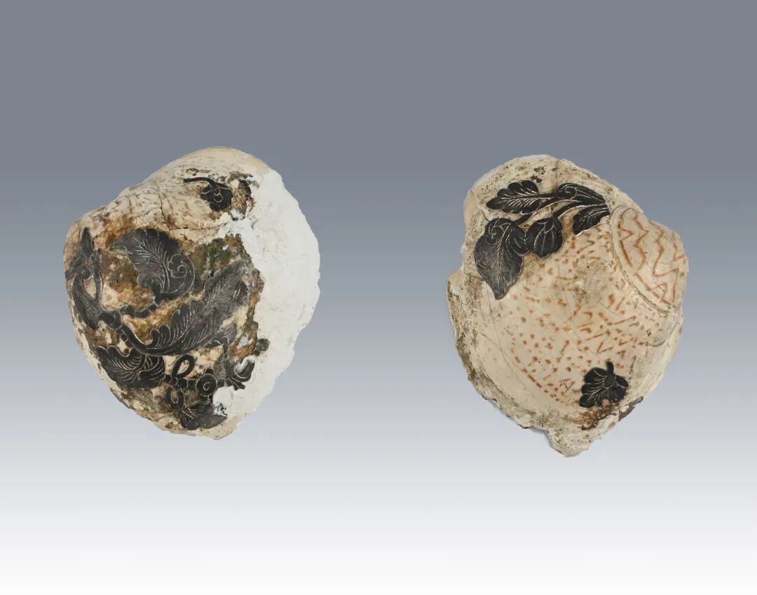用天然贝壳制作而成。表面粘贴有银质叶状图案,呈黑色,背面有褐色斑纹。据考古专家推测,随葬器物中的这些装饰品及其图案和材质,可能体现了墓主个人的喜好。