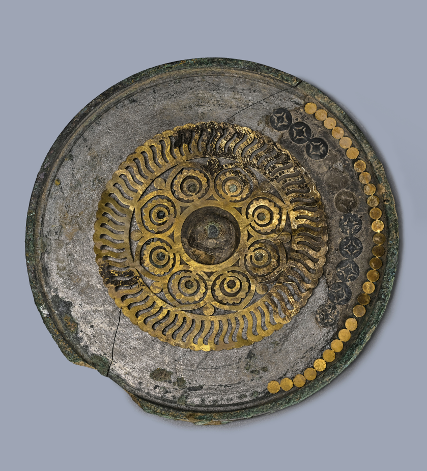 圆形,半球形钮,镜背贴布髹漆,围绕镜钮最内层为八瓣心形金片宝相花纹,每瓣为三重,最内重中心处为绿色玻璃珠;宝相花纹外为一周镂空曲栉齿环带;最外层为一周银片圆形方孔钱纹和一周金片联珠纹。