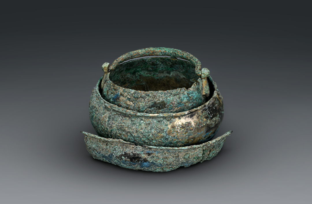 ◐提梁罐、钵及盆3件器物出土时,自上而下依次叠置。